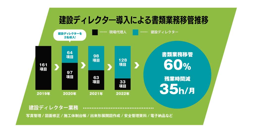 同社では建設ディレクターに移管する全仕事のうち、いまは6割のペース、新年度はさらに8割移管を目指しています。