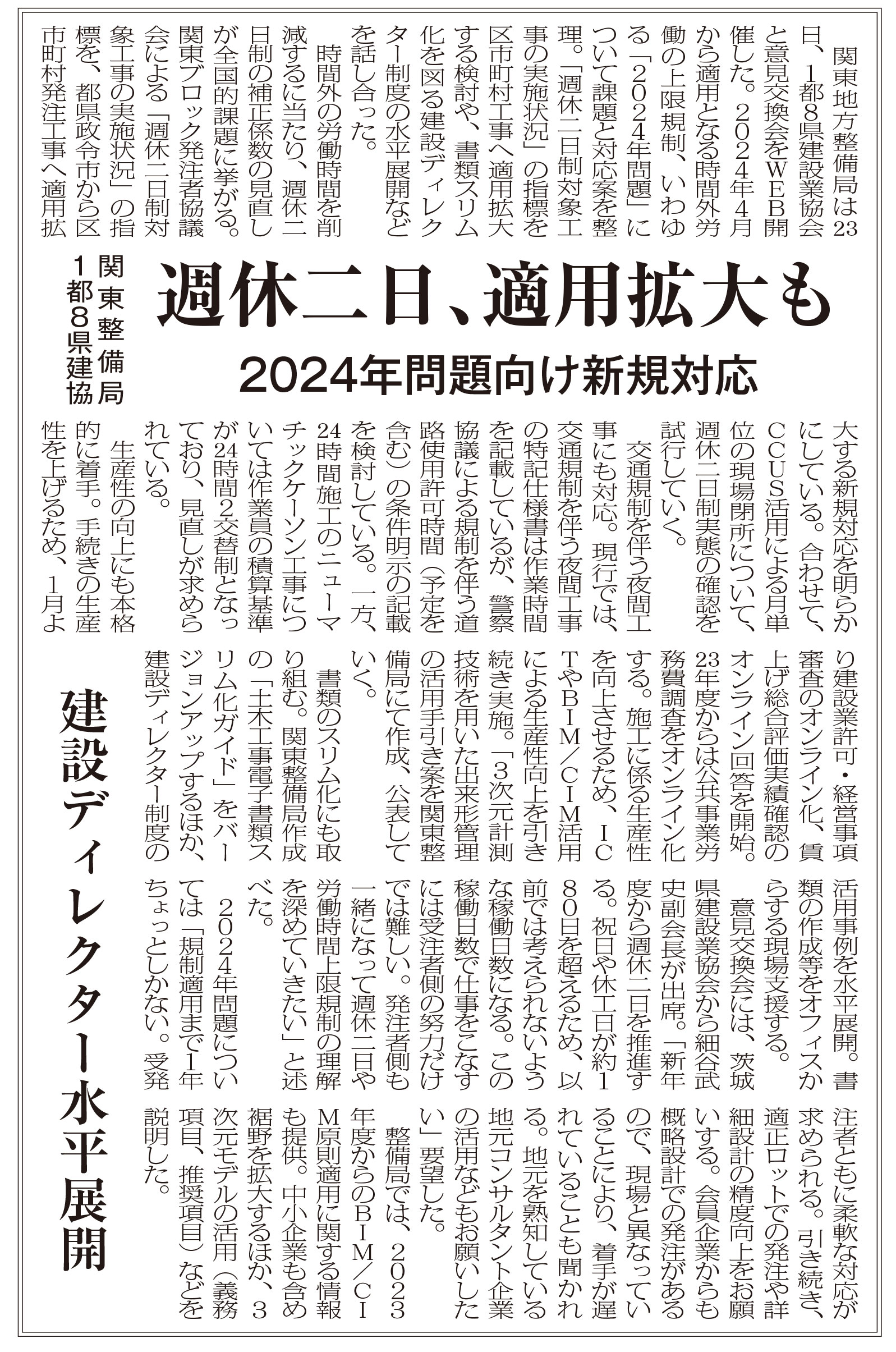 「週休二日 適用拡大も・建設ディレクター水平展開」と日本工業経済新聞に掲載