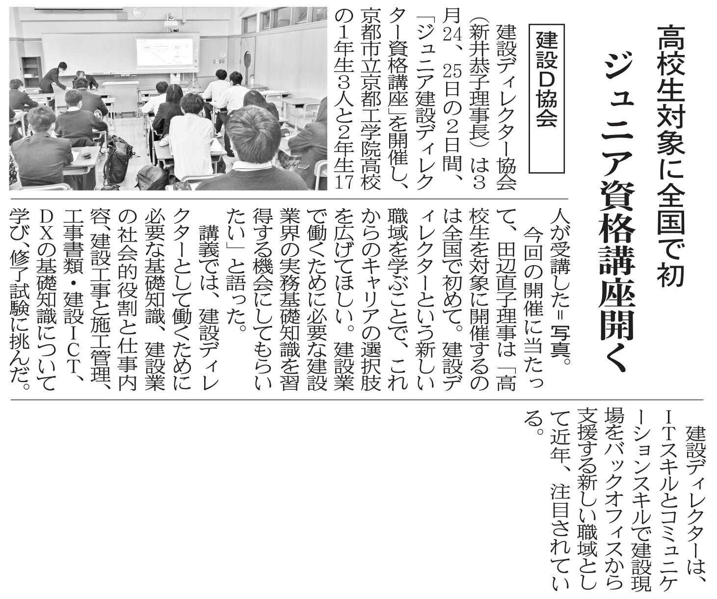 HOME / 協会からのお知らせ / 「ジュニア建設ディレクター資格講座」開催について掲載
