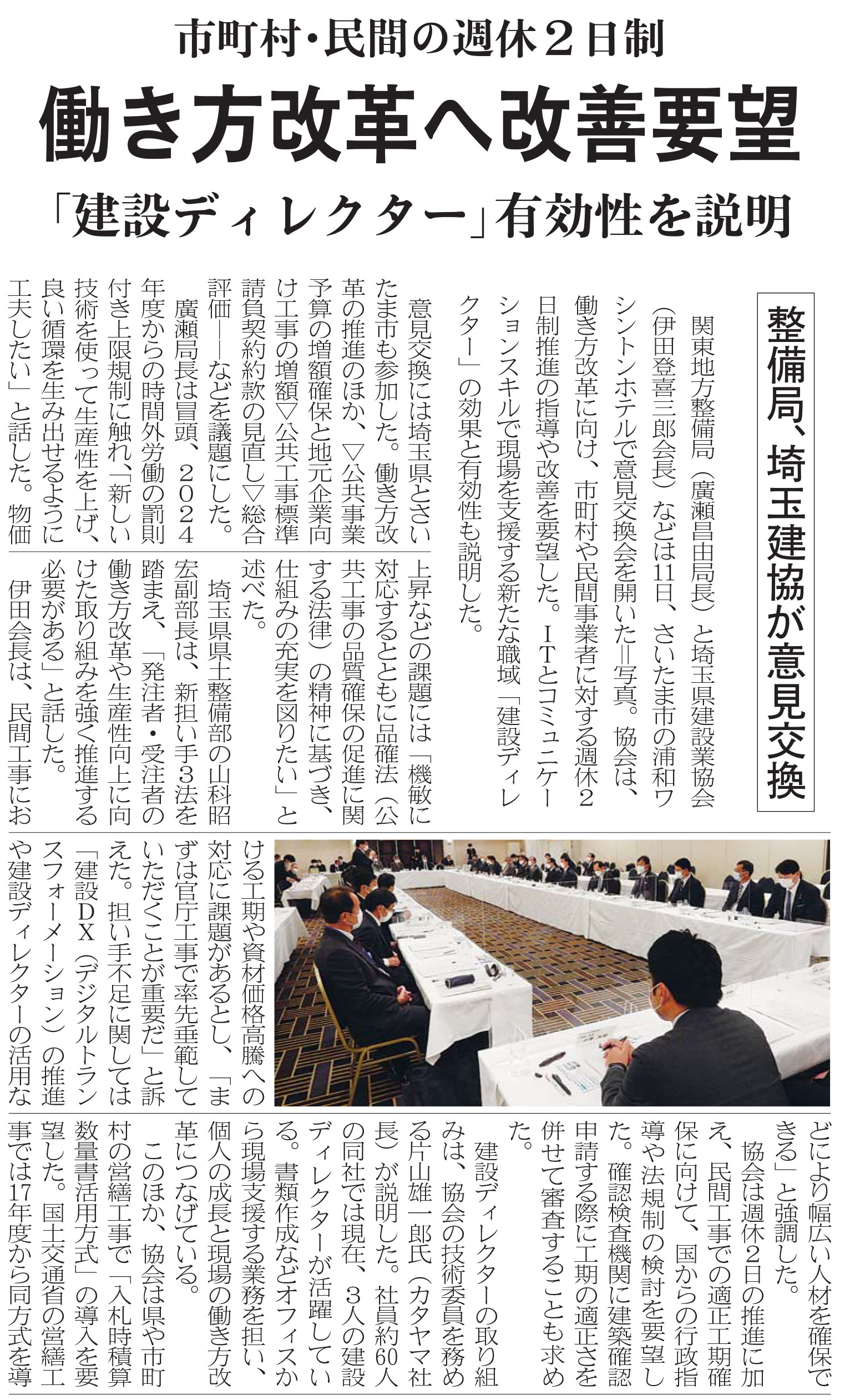 HOME / 協会からのお知らせ / 関東整備局、埼玉建設業協会の意見交換会「建設ディレクター有効性を説明」として記事を掲載いただきました。