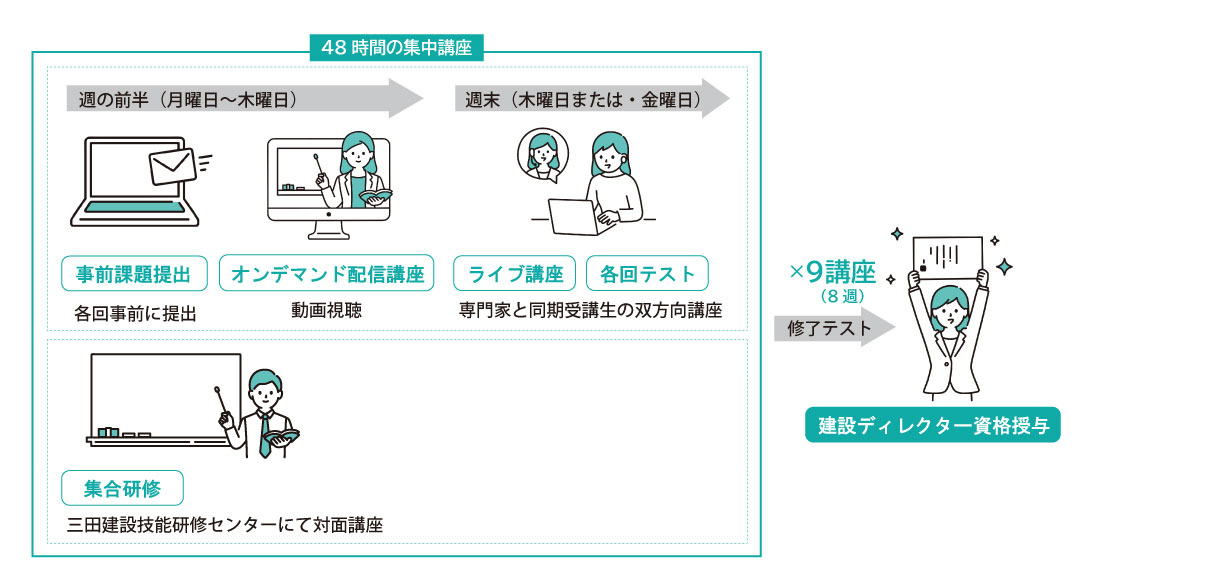 | 受講対象となる方 | ●建設ディレクターとして活躍を目指す方 ※集合研修時に三田研修センターまで通学できる方 |