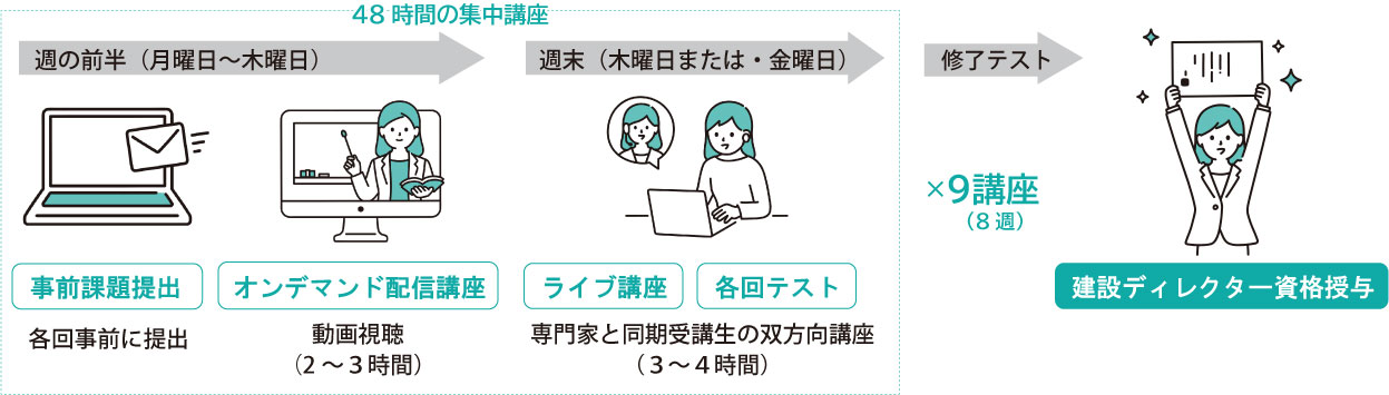 | 講座形式 | ●オンデマンド・ライブ講座 ※日程・時間は変更となる可能性がございます。合計8週、全9回、48時間の講座となります。 ※ライブ講座の振替は対応しておりません。 |